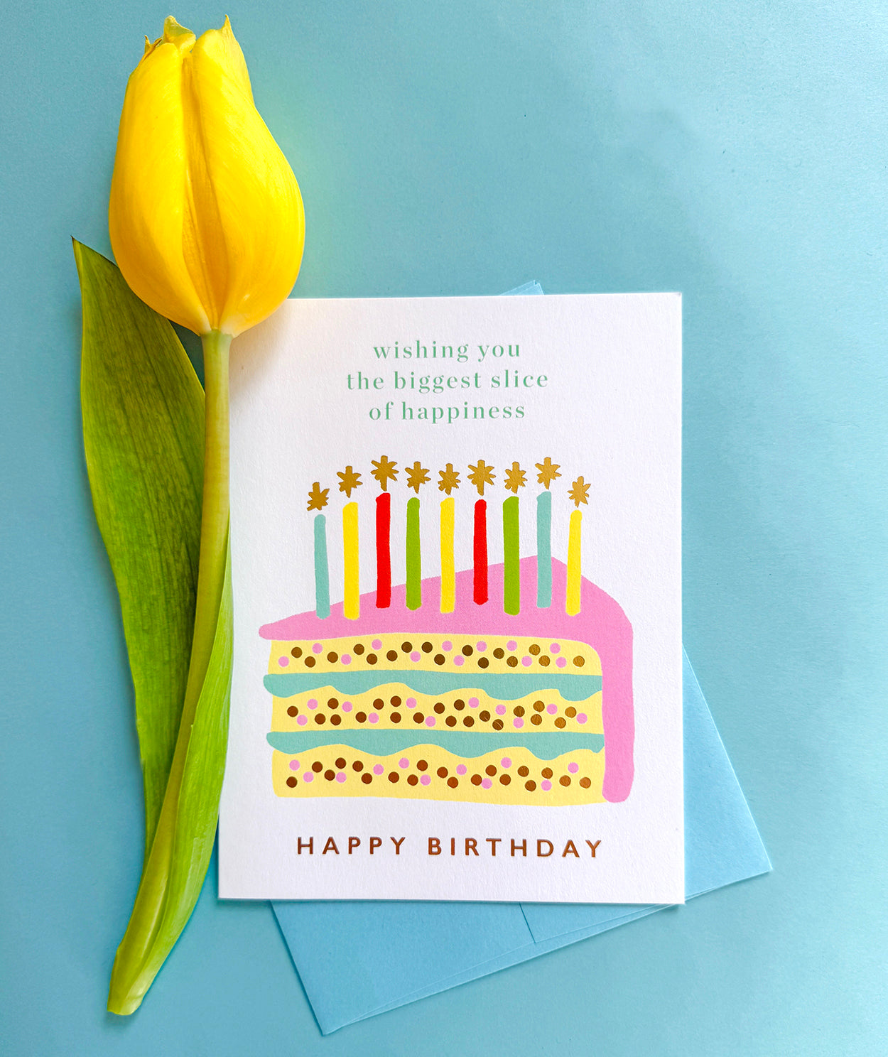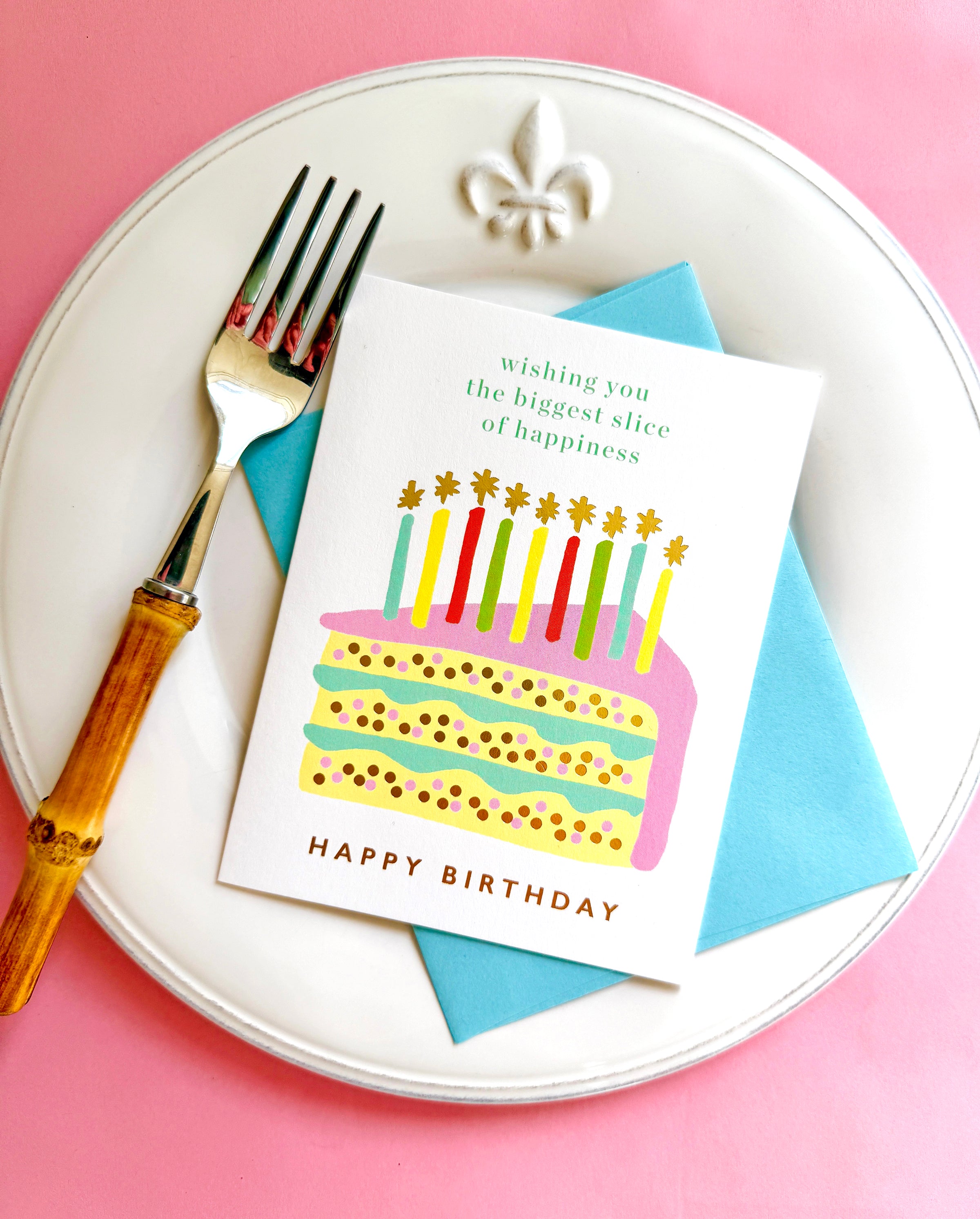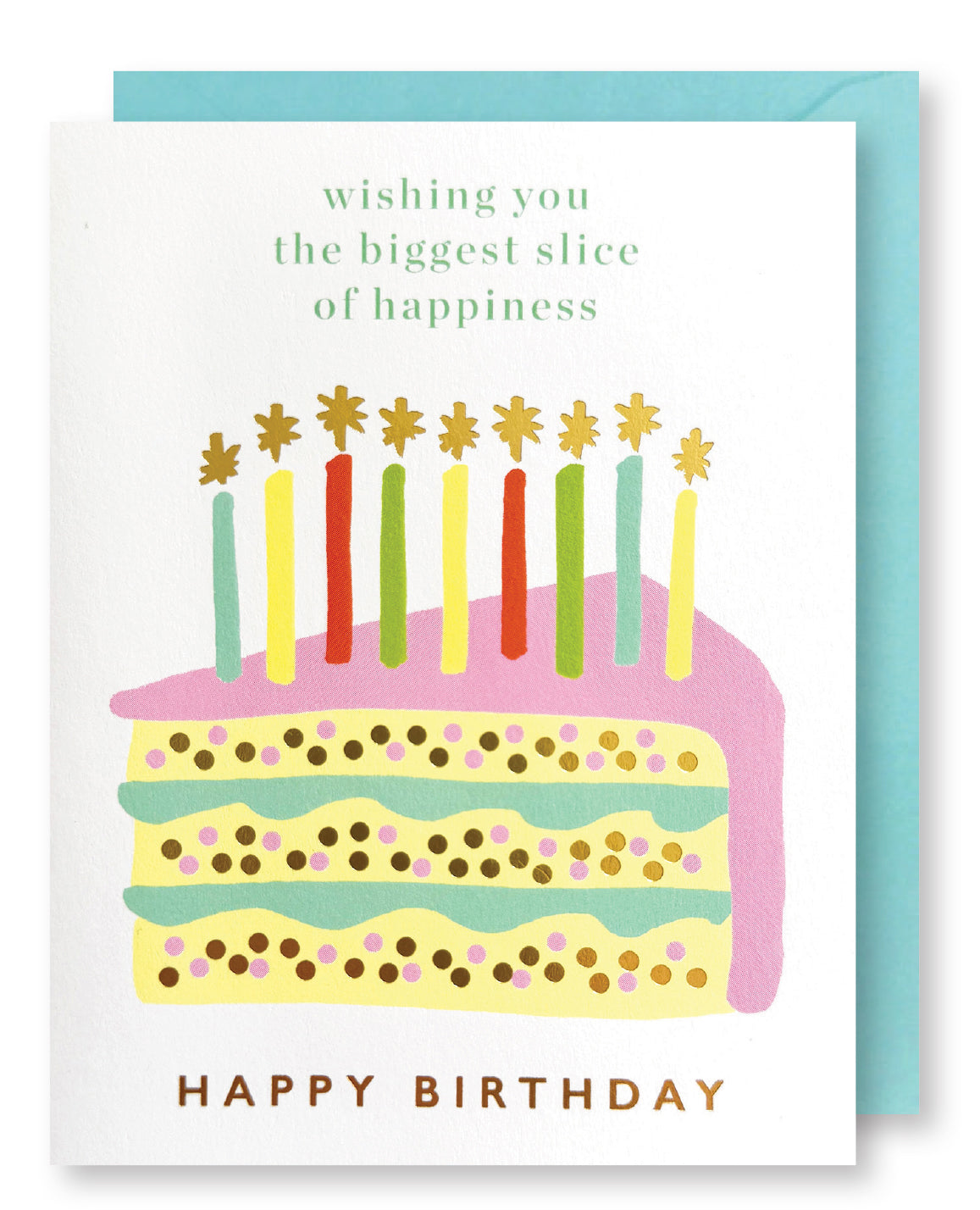 New for 2026! A pretty confetti cake sparkles with gold foil detailing, and flickering gold-flamed candles.